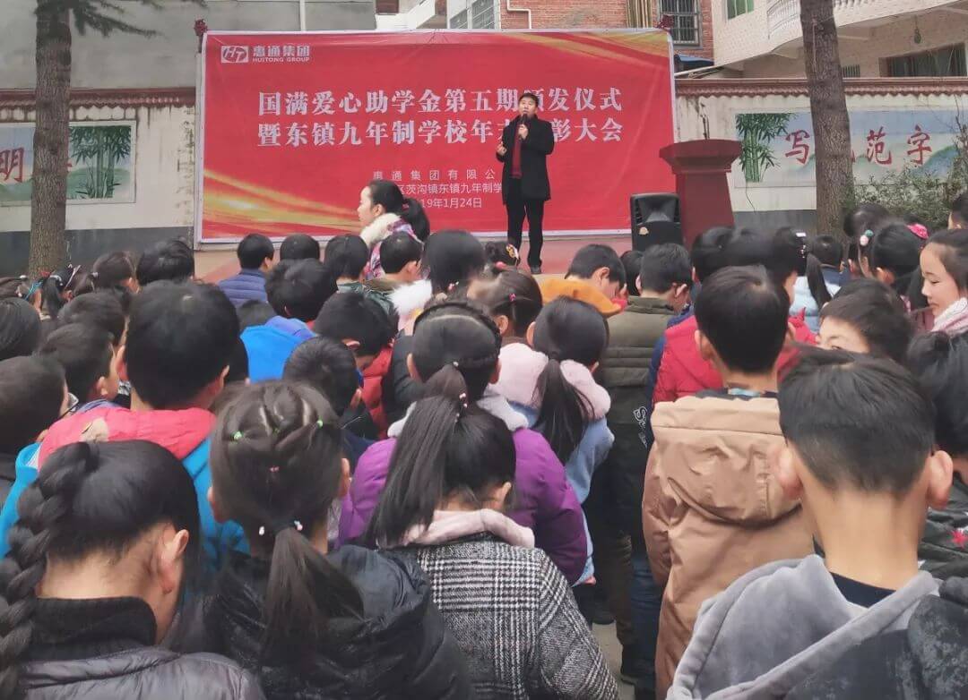惠通集团在陕西汉滨区茨沟镇东镇九年制学校发起第五届”国满爱心助学基金”公益助学活动,51名学生获得奖励及资助,到今天,”国满爱心助学基金”已顺利进行了五届,5年来共资助学生三百多名。
